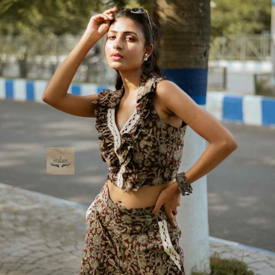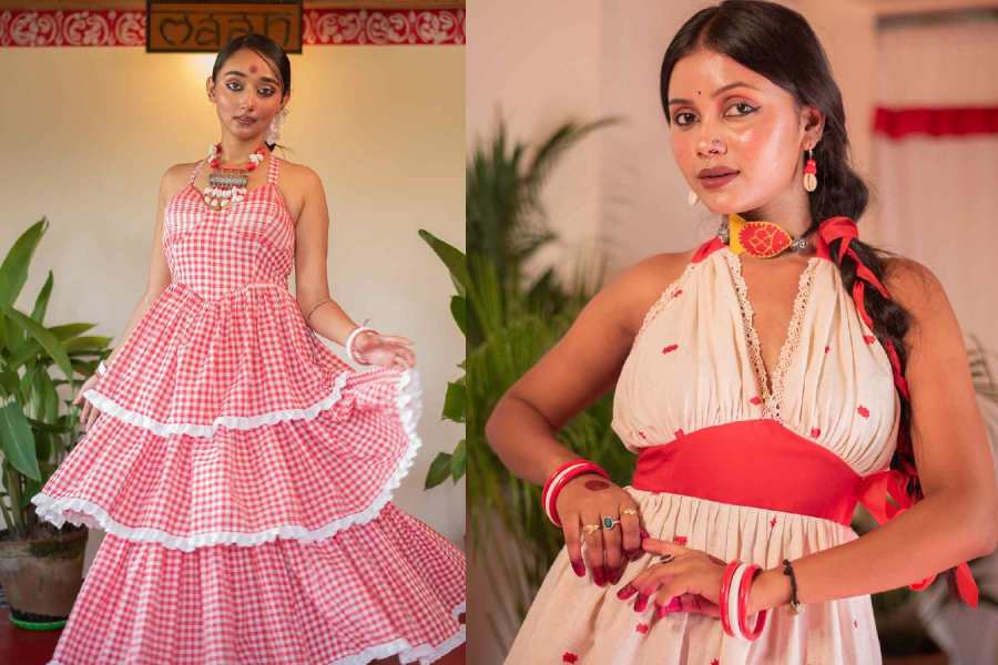 “Maan is a brand that originated in Kolkata. Thus, we believe in worshipping the vibe and tribe of Bengali aesthetics. Being Sabeki is the next aesthetic. Durga Pujo is coming and the laal-shaada colour combination perfectly captures the spirit of the festival. For fabrics, we have used pure jamdani, pure khadi and the like. We aim at building a sustainable future together,” said Das.