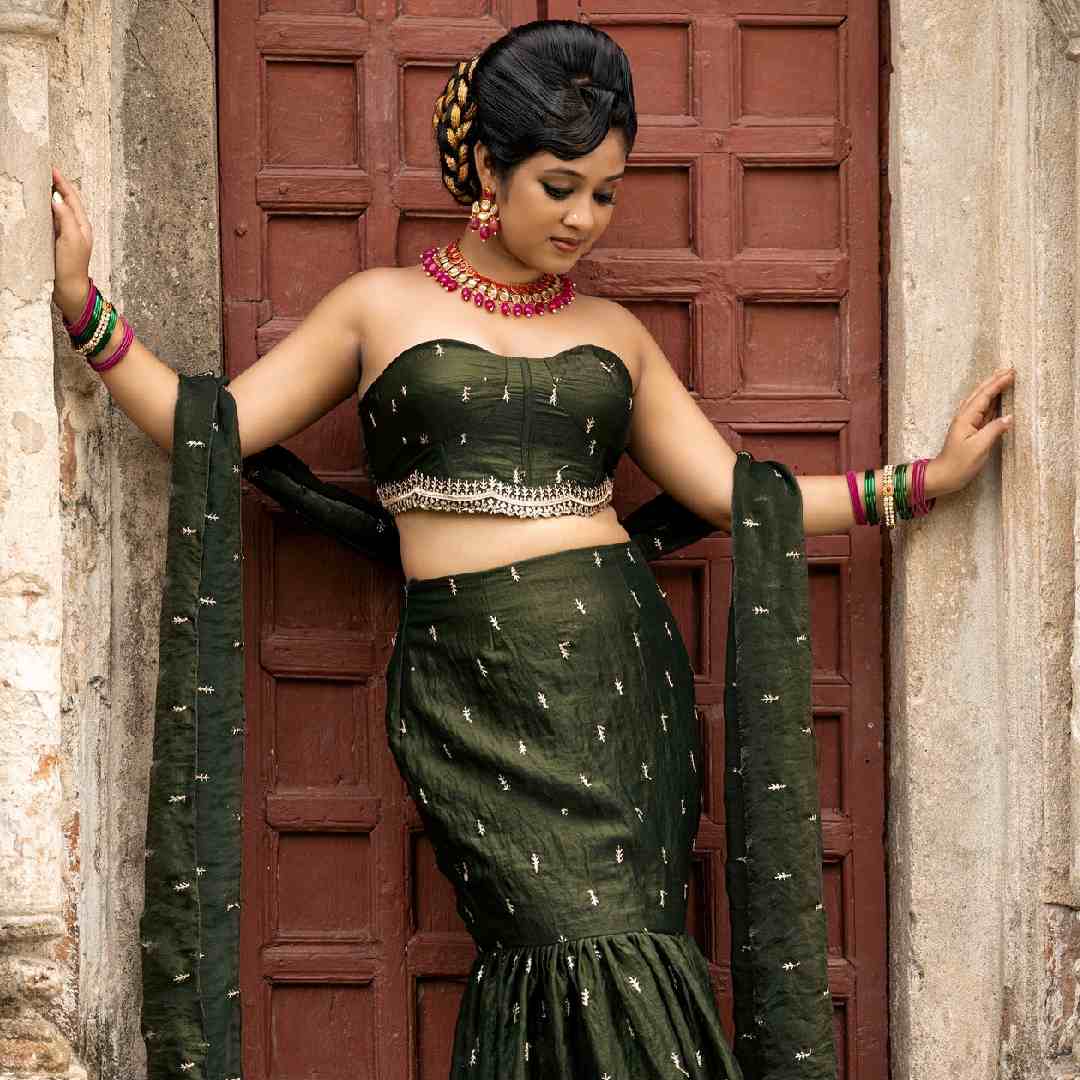 For a fuss-free festive look, pair a crop top with coordinated trousers. It’s perfect for standing in long queues and hopping from one pandal to another. A sleek bun or casually clipped-back hair with dainty studs will keep the look balanced. Complete the outfit with chic flats of your choice.