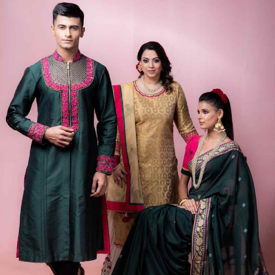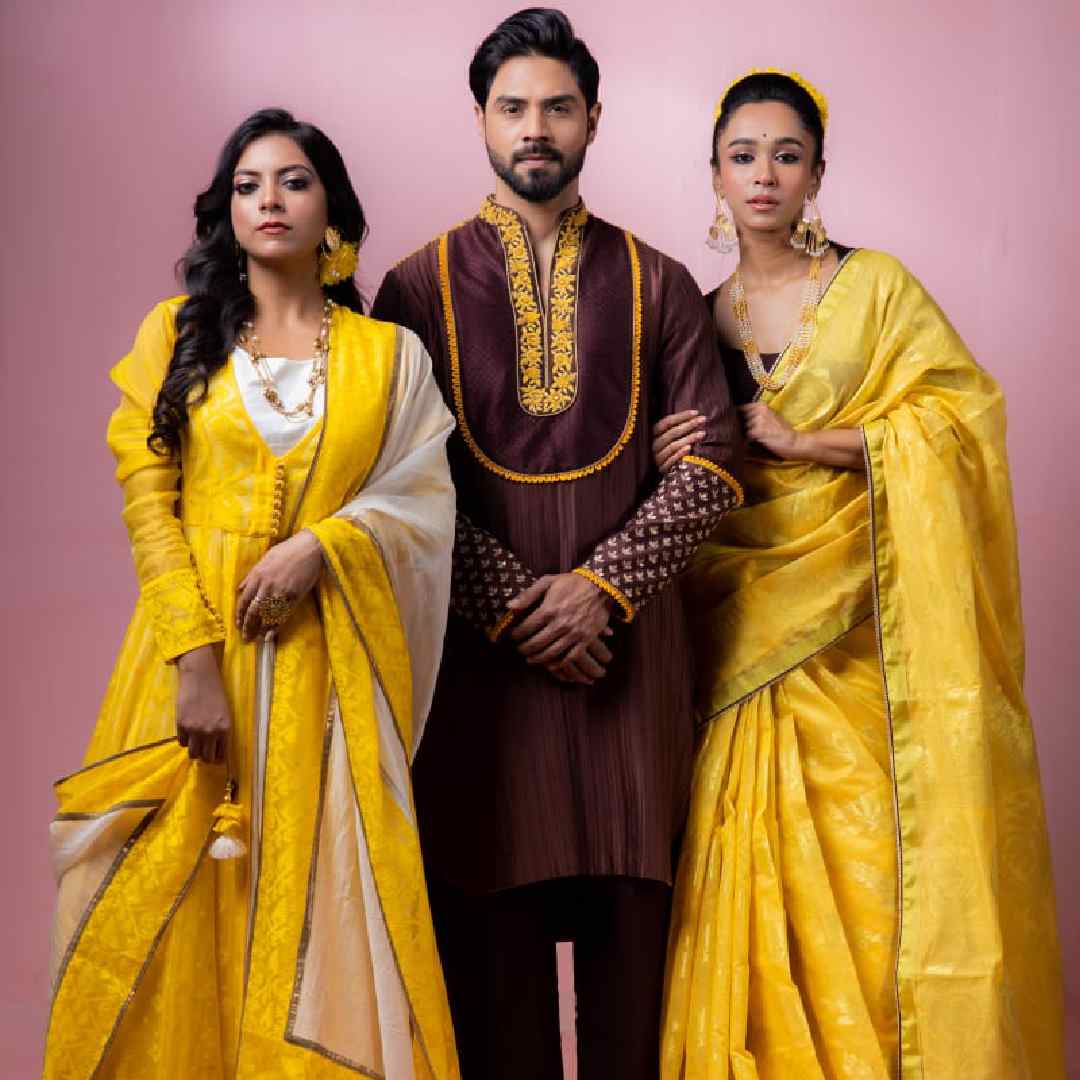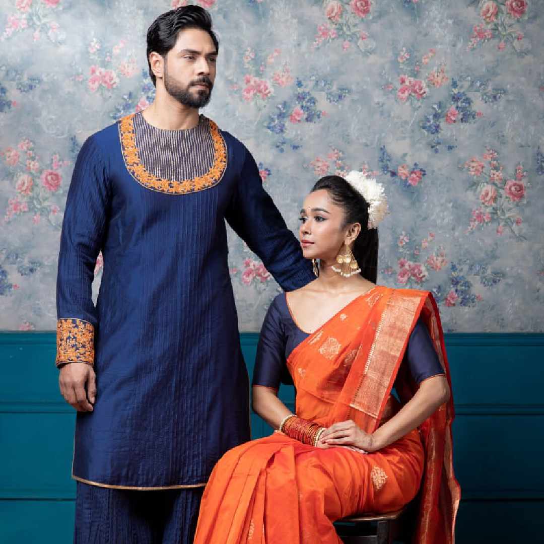 Coordinated outfits with partners work well too. For instance, a brown kurta complementing a yellow sari draped over a brown blouse.