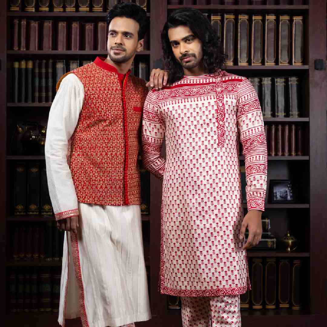 Printed kurta sets with ethnic motifs are also a trendy choice for the Pujas. Pair them with an embroidered jacket for that extra rizz.