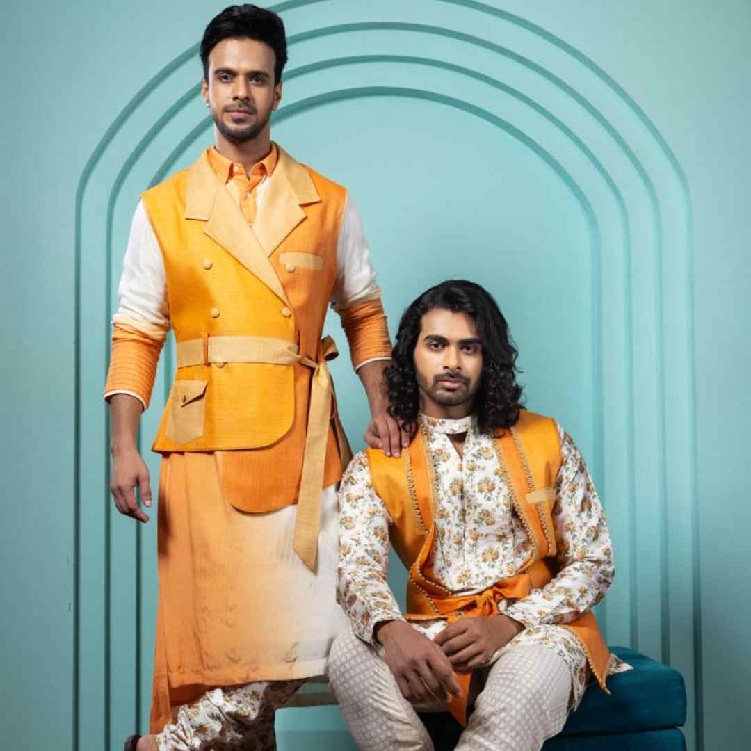 Men can also experiment with fusion looks this Puja. Say, a belted jacket with satin lapels worn over a classic kurta-pyjama ensemble.
