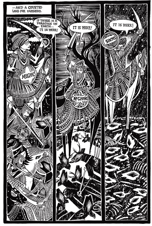 The personal narrative is suspended. The visual style shows striking departures, too. The Mughal period, for example, is drawn in the miniature style, quite a contrast to Sajad's otherwise minimalist style.