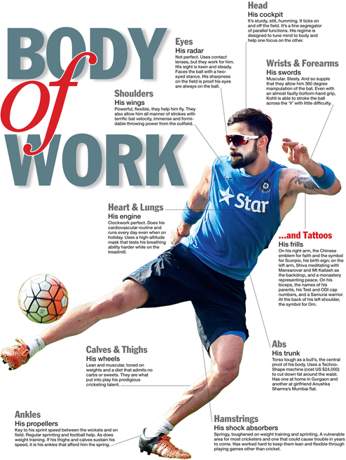 "Track and field athletes have been doing weightlifting for decades. Cricketers, especially batsmen, have never even thought of going anywhere near the barbells," says Amogh Pandit, strength and conditioning coach with the Mumbai Cricket Association. But Kohli clearly is in a different league. His friend and manager Bunty Sajdeh says: "He was deeply impressed by the fitness of players such as Kevin Petersen and AB de Villiers. He just looked at himself in the mirror one day and said he will change himself to compete with the best."