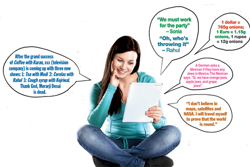 Some of the jokes can be wildly irreverent. Take this one, which says: After the grand success of Coffee with Karan, xxx (television company) is coming up with three new shows: 1: Tea with Modi 2: Cerelac with Rahul 3: Cough syrup with Kejriwal. Thank God, it goes on to add, Morarji Desai is dead.