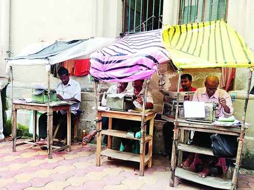 Thakur, who takes the Circular Railway services from Barasat in North 24-Parganas to Eden Gardens and walks thereafter, is running late today. He opens the top few buttons of his shirt, fans himself a bit with a hideous pink Chinese thing between gulping down fistfuls of puffed rice and starts working on an affidavit. "This machine is all iron. Weighs about 10 kilos. It is not possible to carry it home and back every day. We leave it there for a monthly fee," he gasps as he points to one of the olden buildings.