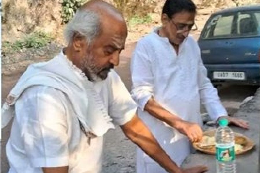 Photos of Rajinikanth eating a meal served on pattal (an eco-friendly plate made of dried leaves) by the roadside have gone viral. He sported an all-white traditional outfit.