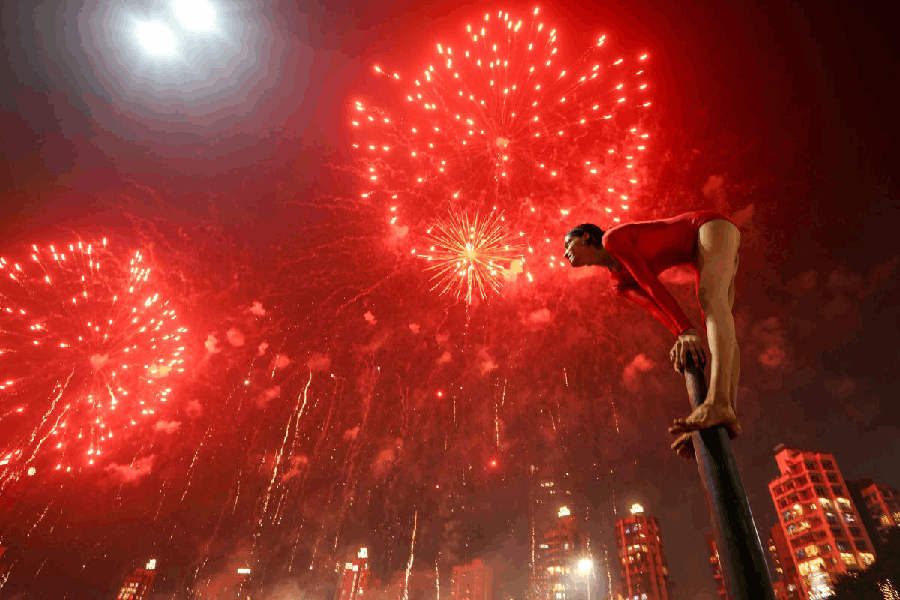 A student of Shree Samartha Vyayam Mandir performs 'Mallakhamba' as fireworks light up the sky in the backdrop during the 'Diwali' festival, in Mumbai, Monday, Oct. 20, 2025. (PTI)