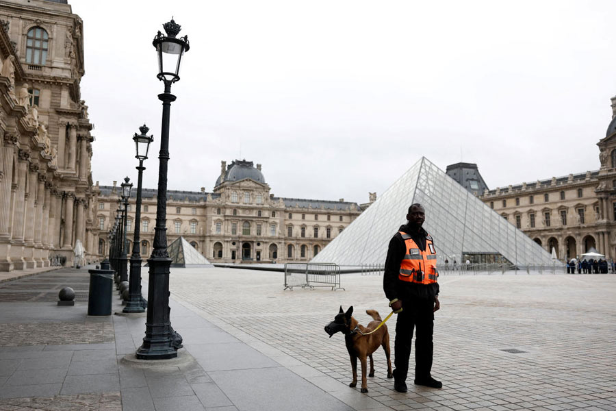 A security employee with a dog stands near the glass Pyramid of the Louvre Museum as the museum remains closed the day after a spectacular jewel heist by thieves who broke into the landmark by using a crane and smashing an upstairs window, stealing priceless jewelry from an area that houses the French crown jewels before escaping on motorbikes, in Paris, France, October 20, 2025. (Pictures: Reuters)