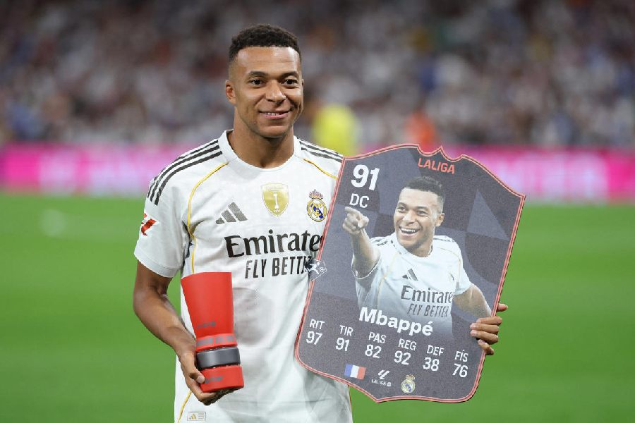 Real Madrid's Kylian Mbappe poses with an award on the pitch at Santiago Bernabeu, Madrid, Spain on October 4, 2025. (Reuters)