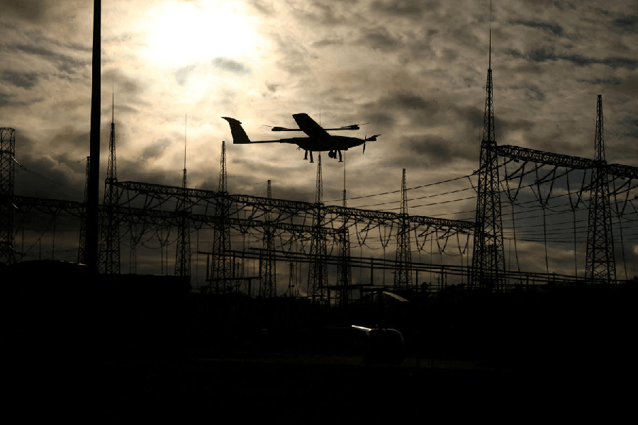 Polish transmission system operator PSE (Polskie Sieci Energetyczne) drone lands after monitoring power lines, part of the route of the LitPol, the interconnection between Poland and Lithuania at Elk Bis substation near Elk, Poland. (Reuters)