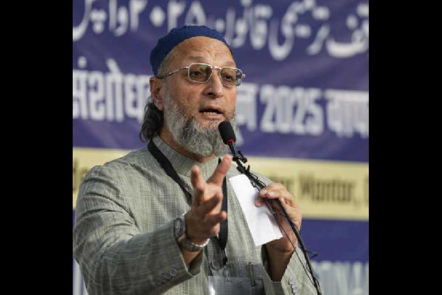 Asaduddin Owaisi at a protest against the Waqf Amendment Act at Jantar Mantar on Saturday.  PTI
