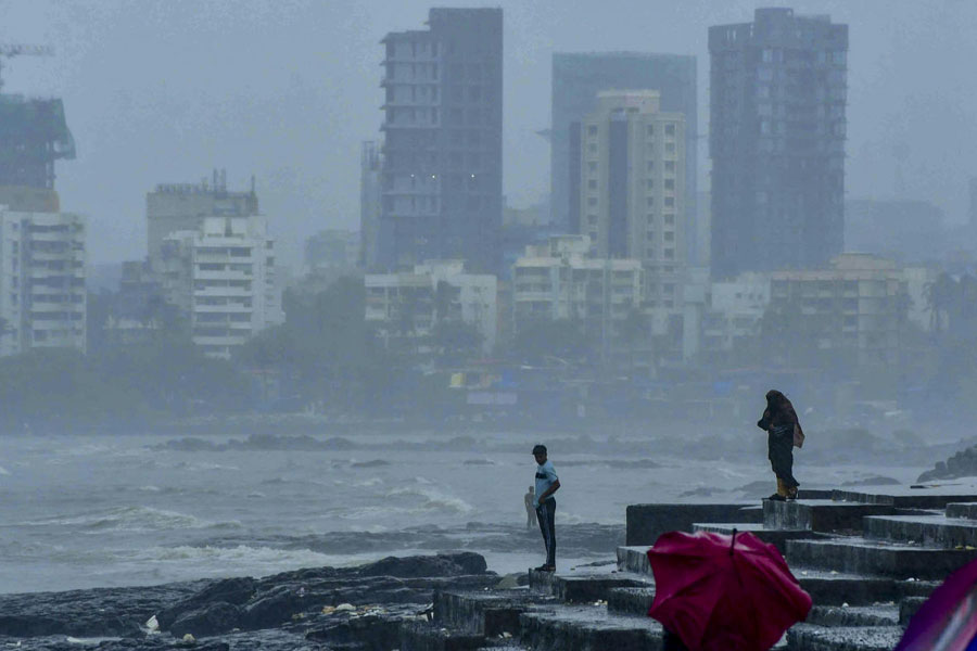 People walk along a shore amid rainfall in Mumbai. PTI