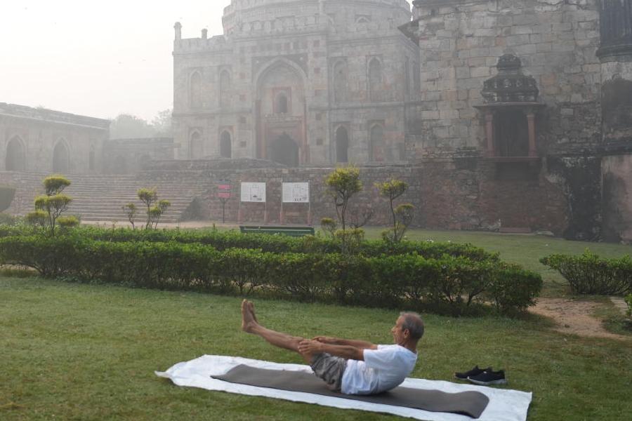 A man performs 'yoga' on a hazy morning as thick smog engulfs the city, at Lodhi Garden PTI picture