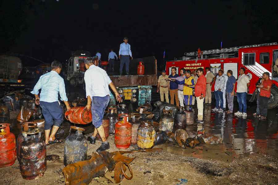 People carry a charred LPG cylinder after a truck carrying the cylinders caught fire following a collision with a tanker on the Jaipur-Ajmer highway. PTI