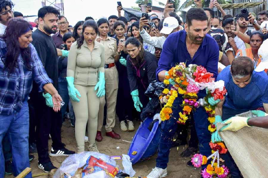 Bollywood actor Akshay Kumar, Maharashtra Chief Minister Devendra Fadnavis' wife Amruta Fadnavis, and civic chief Bhushan Gagrani joined the special cleanliness drive at the famous Juhu beach here on Sunday after the conclusion of the 11-day Ganpati festival.