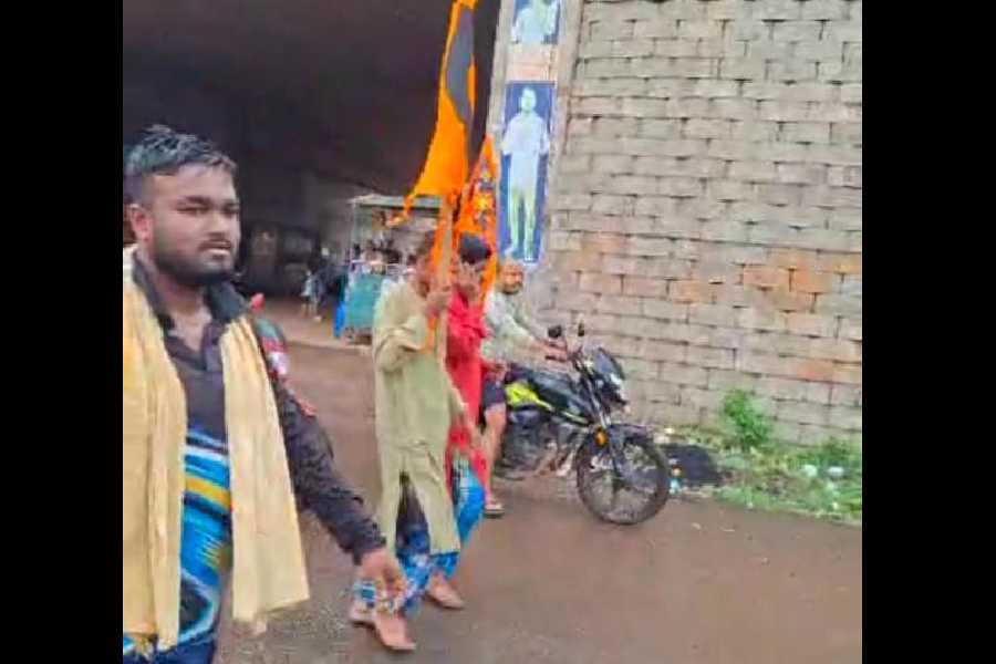 A grab from the video shows the youths being paraded with saffron flags in Khuntuni Sourced by the Telegraph