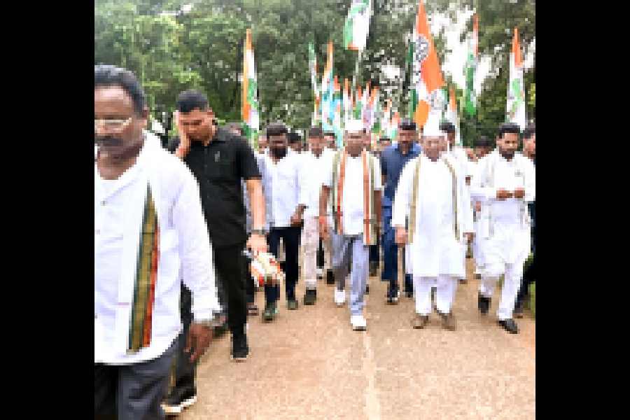 Odisha Congress workers take part in Gandhi Pathee at Motu in Malkangiri district on Thursday The Telegraph