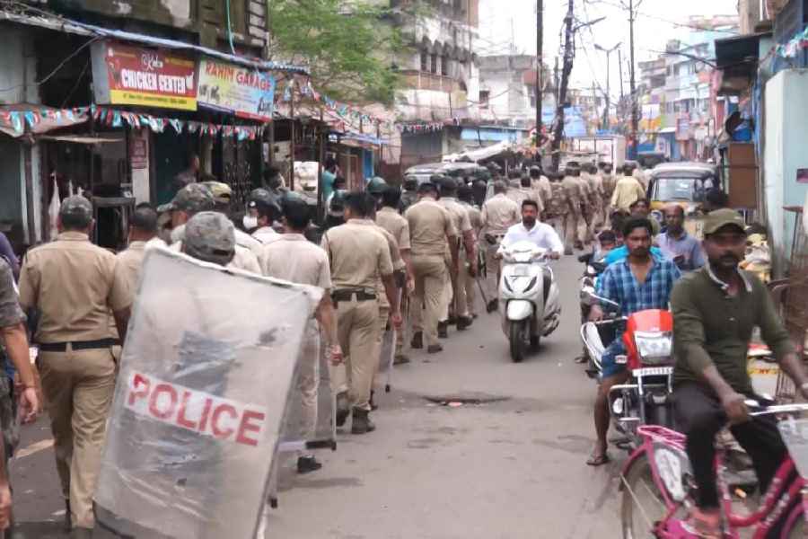 The flag march conducted by police personnel in Cuttack on Sunday. Sourced by the Telegraph