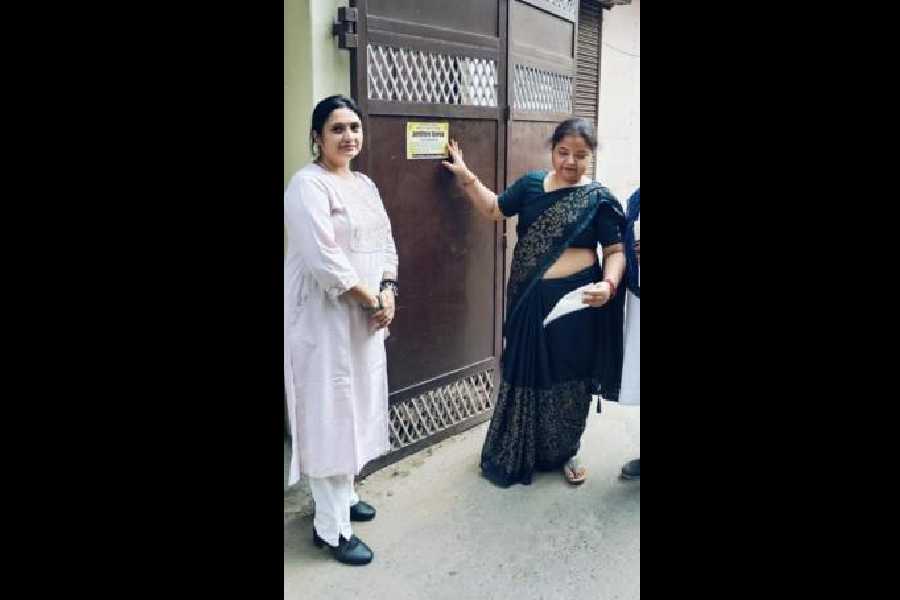Residents stick the Operation Belpatra bill on the gate of a house in Varanasi Sourced by the Telegraph