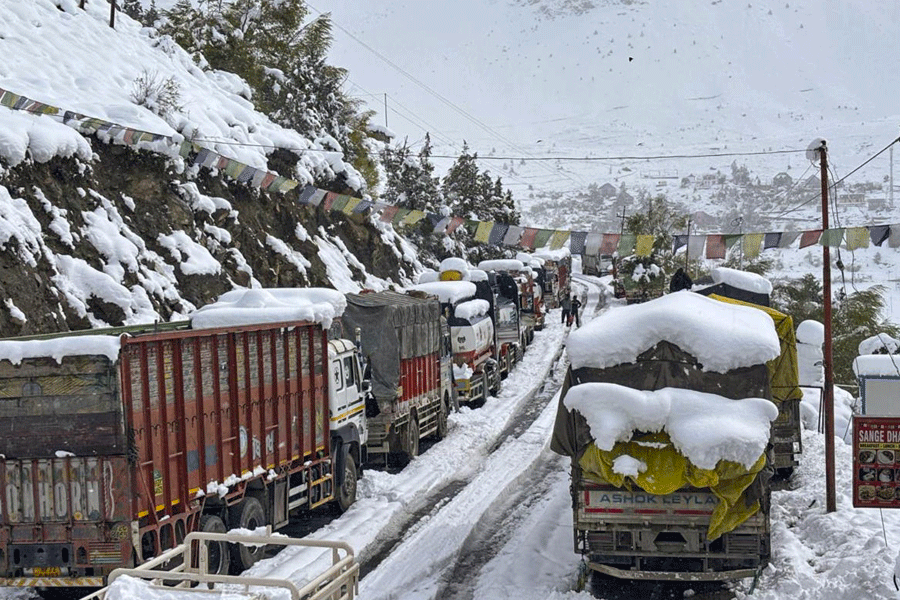 Vehicles in a queue as traffic disrupted on Manali-Leh Highway due to heavy snowfall, in Lahaul and Spiti, Wednesday, Oct. 8, 2025. PTI