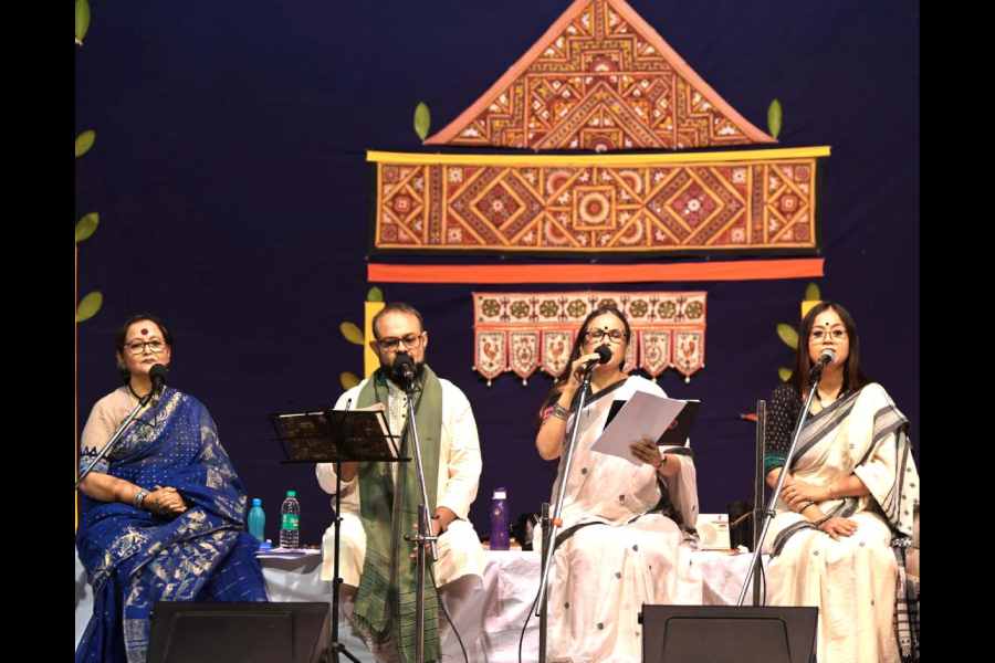 Words and music, each better than the other, made the Kanika Banerjee Memorial Trust’s session, Barsha — Santiniketan, at Sisir Mancha a memorable evening. The clarity of the singers’ renditions transformed the performances, leaving the audience satisfied about a Sunday well-spent. It was heartening to see long queues before the doors of the auditorium had opened.
