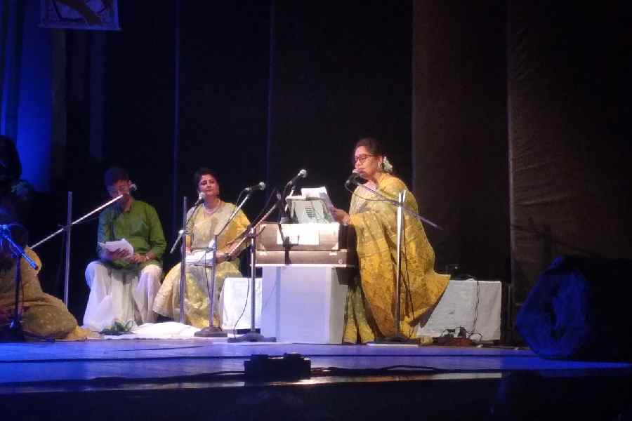 The renowned vocalist, Apala Basu Sen, directed Hey Mon, presented by Brati at G.D. Birla Sabhaghar. Hey Mon refers to the mind and cognition, cardinal elements of Rabindranath Tagore’s musical creations. Sen’s curated ode started with a group performance of “Dnaarao, mon, anonto bromhando majhe” by Brati’s students. Among the other performances, solo recitals like “Tui phele eshechish kare” by Jayati Chakraborty (picture), “Ami sangshare mon diyechinu” by Iman Halder and “Ei kothati mone rekho” by