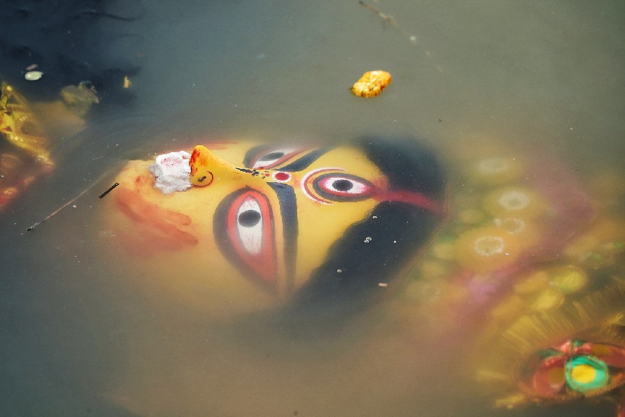 The painted face of the idol floats on the water, a quiet moment after the vibrant celebrations.