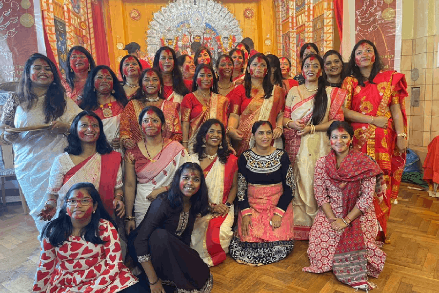 The bhog menu remained as elaborate as ever: steaming khichuri, labra, beguni, paneer dishes, pulao, dal, chutneys, payesh and Bengali sweets. Essentials such as incense and puja items were brought from Kolkata. “We prepare the sweets by hand and cook bhog together every day,” said Gargi Bhattacharyya, a founding member. “It keeps the rituals alive and strengthens our bonds as a family.” The idol, handmade in Germany, was reused with minor touch-ups. “This year the focus was on décor and theme,” explained Dipankar Sarkar, the artist behind the idol.