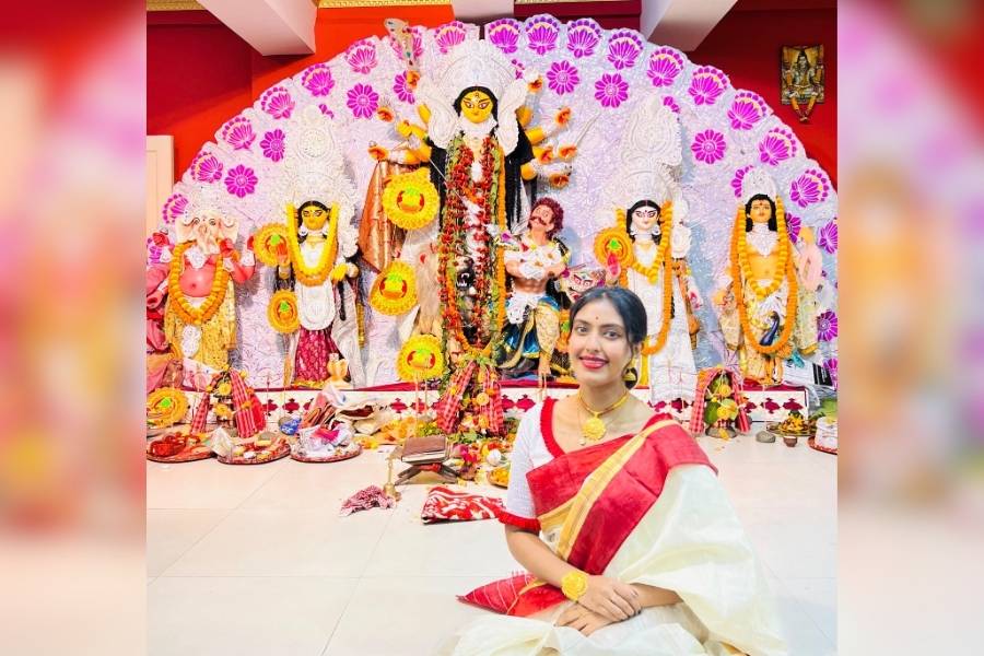 Dressing up is equally important. “Fashion during Pujo feels like a celebration not only of tradition, but also of expression. I usually lean towards traditional attire, especially the lal-par-sada sari, which is timeless and deeply significant.”