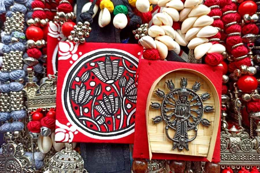A vibrant mix of Bengal’s iconic red-checked gamcha fabric with bold metallic accents, this jewellery set blends rustic tradition with festive glam. The fabric’s earthy tones paired with silver metal give it a contemporary edge, making it an ideal statement piece for pandal-hopping or a Puja gathering.