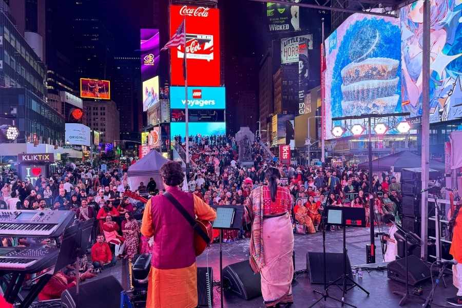 The glittering heart of Manhattan transformed into a celebration of Bengal on October 1 and 2 as Times Square, known as the ‘Crossroads of the World’, hosted its first-ever real-time Durga Puja, organised by the Times Square Durga Utsav Association. More than 50,000 visitors came together to witness the beloved Bengali festival take over the billboard-laden core of New York City.