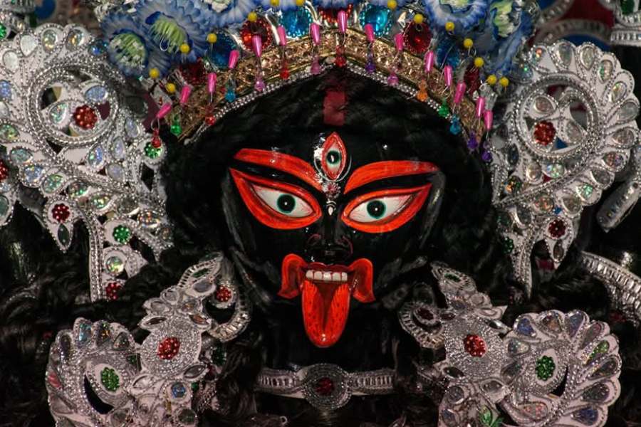 In this form, the Kali is often depicted in black or dark blue and is sometimes shown with a calm, smiling face despite her fierce iconography. The Kali idol, which is about four-feet tall, is made by potters from Kumartuli.