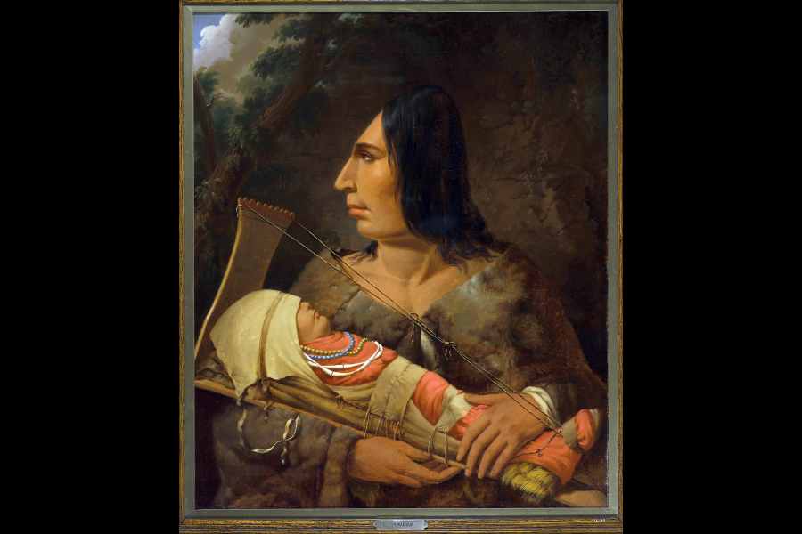 A mid-19th-century painting by Paul Kane, inspired by his travels in the Columbia River Valley, depicts a woman with a child whose head is being reshaped under constant pressure from the cradle’s wooden frame. Royal Ontario Museum via The New York Times