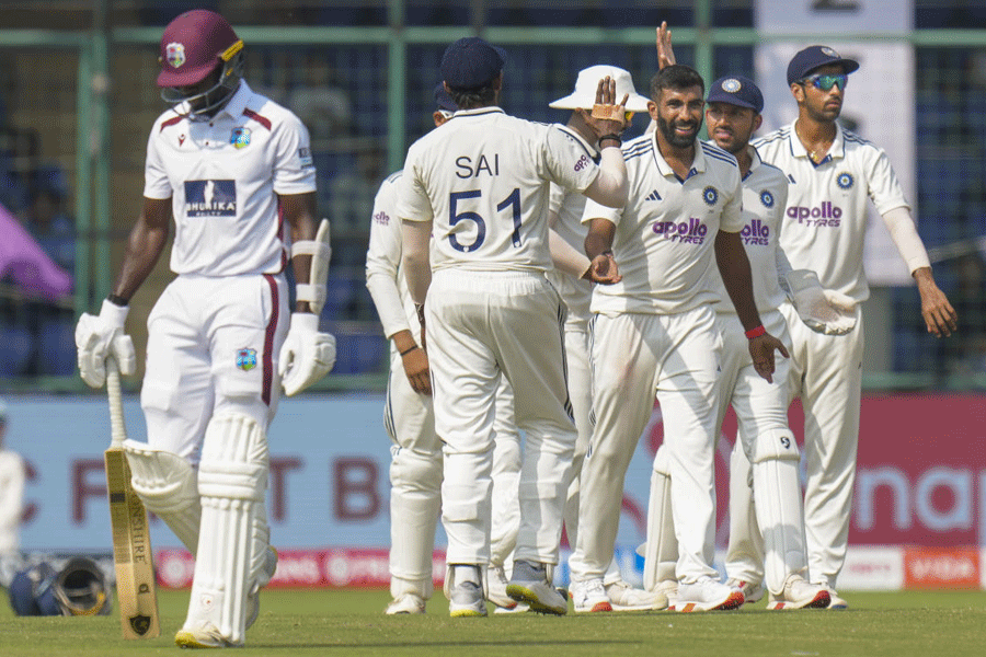 India's Jasprit bumrah celebrates the wicket of West Indies' Anderson Phillip with teammates during the fourth day of the second and final Test cricket match between India and West Indies at the Arun Jaitley Stadium in New Delhi, Monday, Oct. 13, 2025. PTI