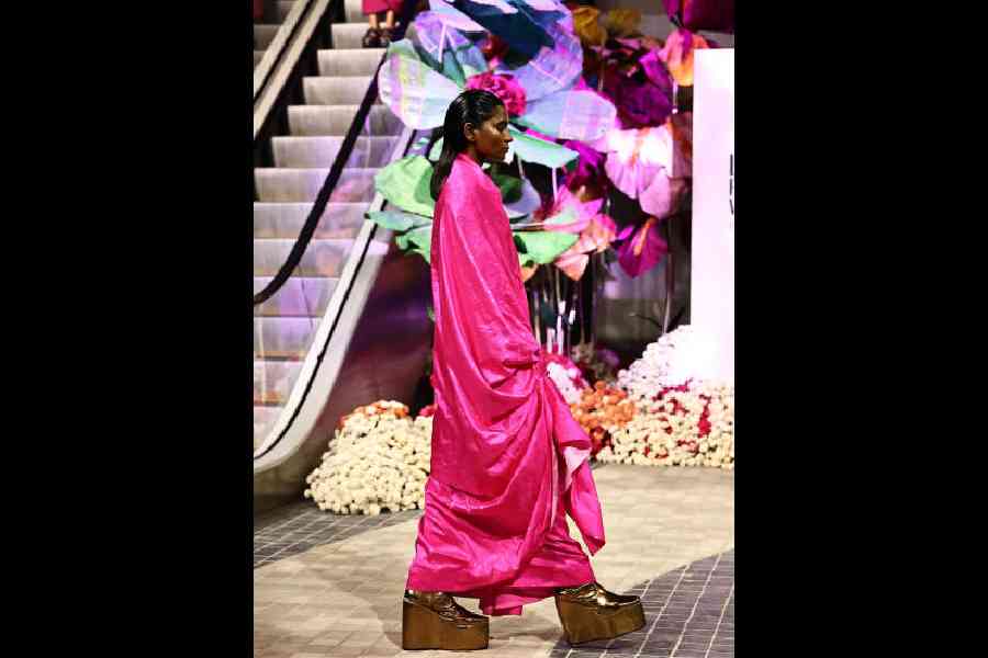 Akaaro’s Starlight closed the opening show. Saris, separates, checks, metallics and pinks mixed with greys and blues in handwoven silk, khadi silk, cotton, and the brand’s signature kinjis, were sexy-stark. Gaurav Jai Gupta, the force behind Akaaro, said his story with pinks started a while back. “I got a call from the Kiran Nadar Museum of Art. They were relaunching the logo, and it had a touch of pink, and I was asked to do some fabrics, and that’s how it started. The colour stayed with me. I think I was quite intrigued by the starkness. There was something about it. It’s intense, right? We just kept developing it, and then when we got this opportunity, we grabbed it and we turned it around. All the work I’ve been doing, the idea is to make it more contemporary. So, I think there’s a lot of power in this show. We continued our journey with blues, which I think we will, and we use them in accents, and just put it together in a way that it just overall looks good and balances it out. And, also, there’s a continuation from the earlier work,” said Gaurav.