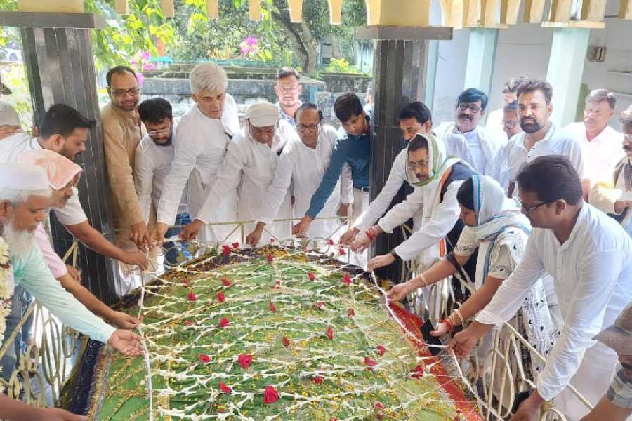 State Congress president Subhankar Sarkar (head covered in a scarf) pays tribute to the tomb of ABA Ghani Khan Choudhury in Englishbazar, Malda district, on Tuesday. Picture by Soumya De Sarkar