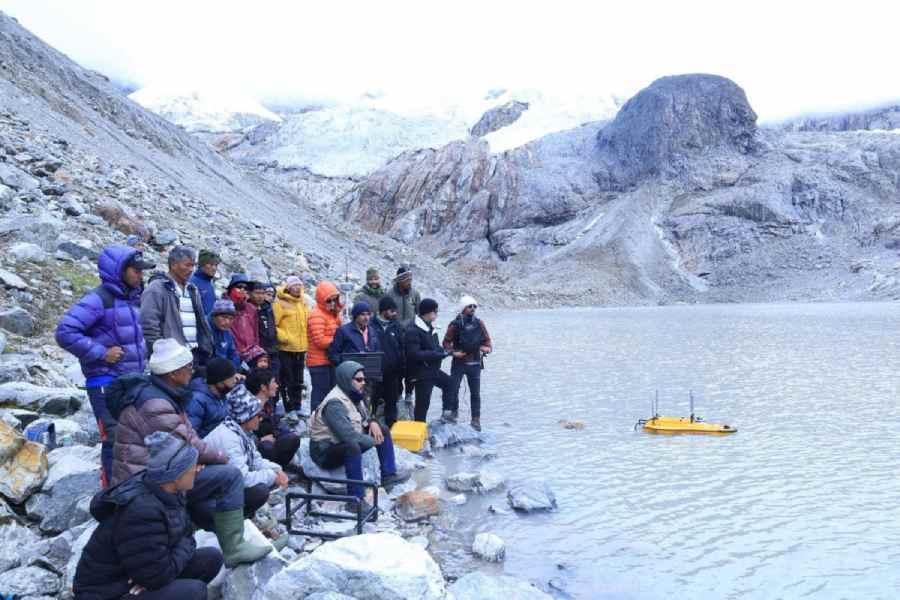 On September 3, the team departed from Thangu and reached Yulhe Kangse base camp for an overnight stay. On the next day, they trekked to Yulhe Kangse Lake, where a traditional ceremony was held before commencing the first bathymetric survey (measuring underwater depth) and sediment sampling of the water body.