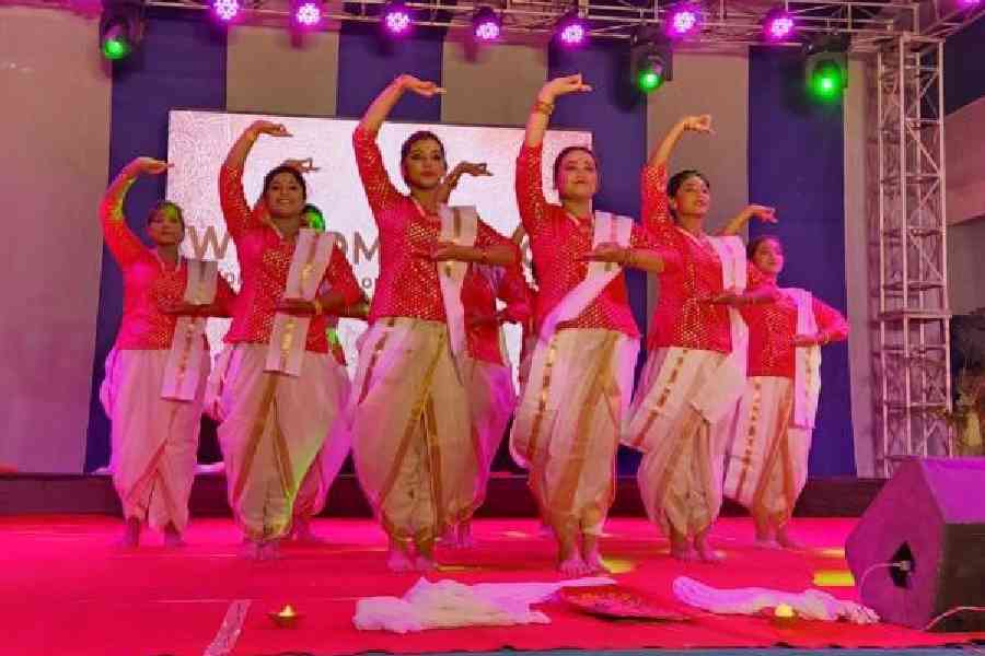 The cultural events began with a dance to the Sanskrit sloka Sangachhadhwam and Tagore’s Anandoloke. “We were choreographed by our dance teachers, Manjusha Banerjee and Romi Roychowdhury,” smiled Snigdha Mondal, when told how well-synchronised she and her friends were on stage. “And now have to rush to change costumes for our dance drama on Bauls!”