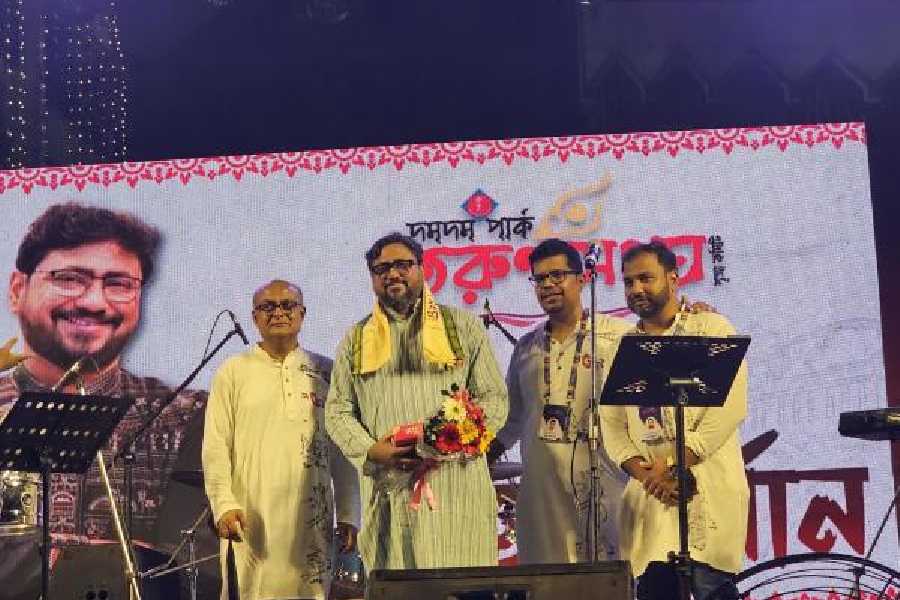 The artist, who stays in Dum Dum Park, promised to give his best to his own neighbourhood puja. A musical evening was organised on the occasion, of which the opening act was Lopamudra Samanta. Her half-hour act included retro and modern chartbusters like Tu mera hero, Lyadka ankh marey and Dum maro dum.