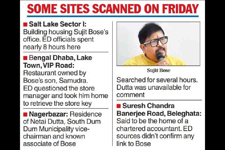 On Friday, ED teams, accompanied by dozens of central paramilitary personnel, fanned out across multiple sites including the residence of South Dum Dum Municipality vice-chairman Netai Dutta, and Bengal Dhaba — a restaurant owned by Bose’s son, Samudra — located at Golaghata in Lake Town. Other locations searched included premises on Sarat Bose Road, New Alipore, and Girish Park.