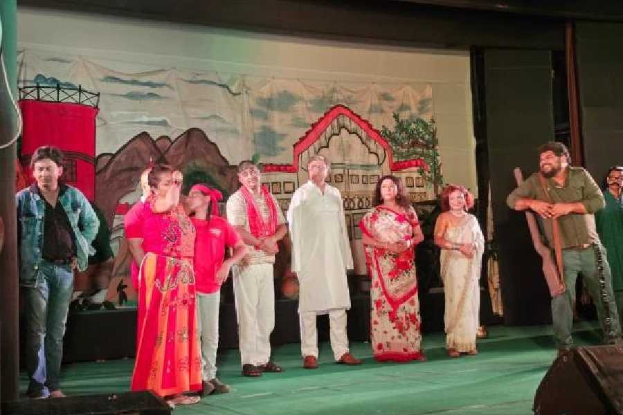 Three puja committee members, the director pointed out, had also pitched in as actors, balancing puja work and rehearsals. “Actually, there was no full rehearsal before we performed tonight. We rehearsed our parts for two or three days in bits and pieces,” admitted Saroj Kumar Roy Chowdhury, one of the three multitaskers. Roy Chowdhury, playing the amputated Thakur Baldev Singh, cut quite a figure with his hands tucked inside his full-sleeved panjabi. “I wear size 44. For the role, I had to get a size 46,” said Roy Chowdhury, who is a retired police officer like his stage persona.