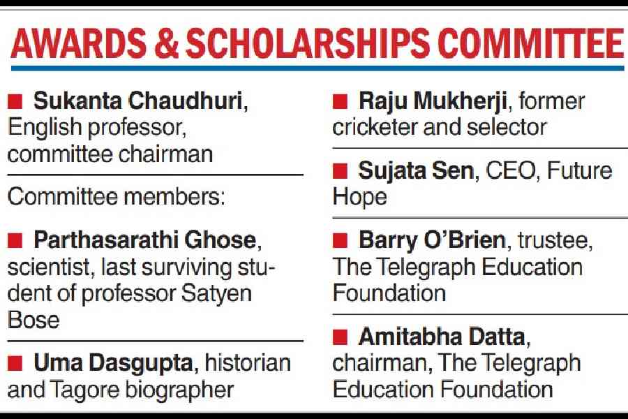 The selection process stretches over 15 days and brings together a distinguished panel. The awards and scholarship committee includes: Sukanta Chaudhuri, legendary English professor (committee chairman); Parthasarathi Ghose, scientist and the last surviving student of Satyendra Nath Bose; Uma Dasgupta, historian and Tagore biographer; Raju Mukherji, former cricketer and selector; Sujata Sen, CEO of Future Hope, which works with children in distress; Barry O’Brien, trustee, The Telegraph Education Foundation; and Amitabha Datta, chairman, The Telegraph Education Foundation.