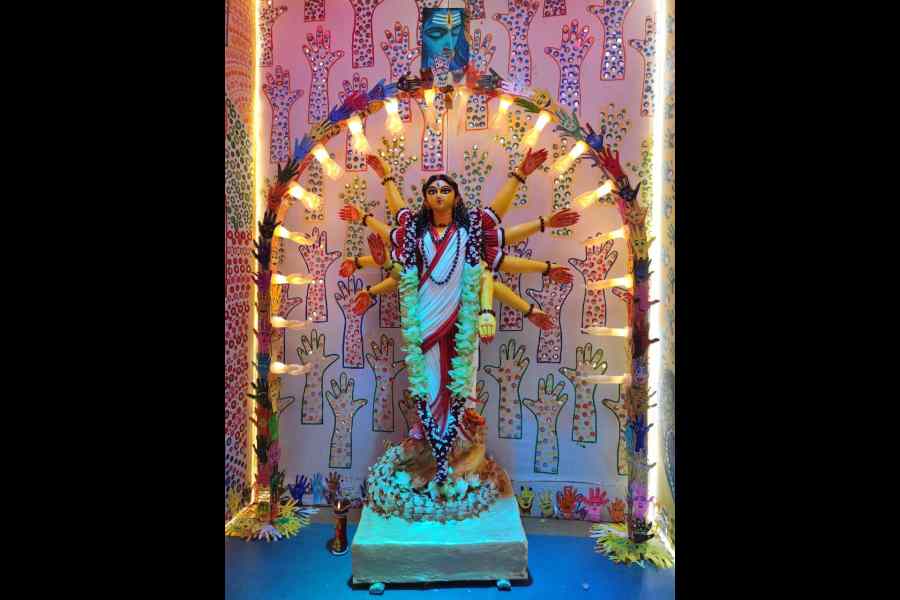 Principal Tilottama Mallik said that the school had been hosting puja for around 10 years, each time with a different theme. “Our message is that education is not restricted to books. Also, we believe in the festival uniting everyone, so people of all religions and professions have worked on it — students and teachers as well as helpers and drivers,” she said. “This is the real spirit of the pujas.”
