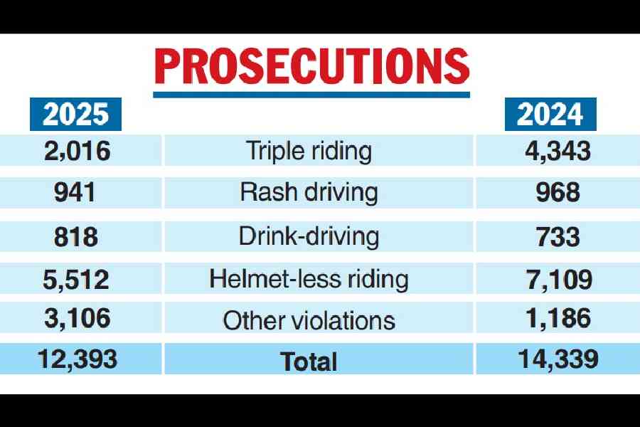 “Last year, 7,109 riders were prosecuted for riding without a helmet between Chaturthi and Dashami. This year, the figure is 5,512. Similarly, this Durga Puja, 2,016 persons have been prosecuted for riding with excess pillion riders, compared to 4,343 last year during the same time span,” an officer said.