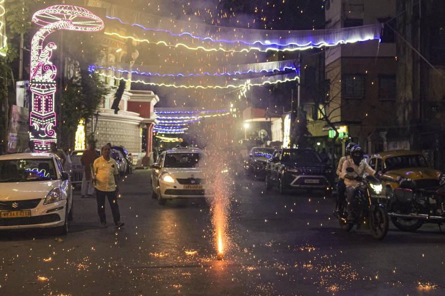 People light firecrackers as part of Diwali festival celebrations, in Kolkata, Monday night, Oct. 20, 2025. PTI
