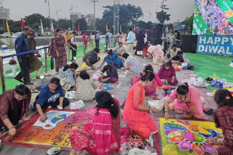 The team from NBCC Vibgyor Towers at work on their rangoli that came second. Pictures by Sudeshna Banerjee