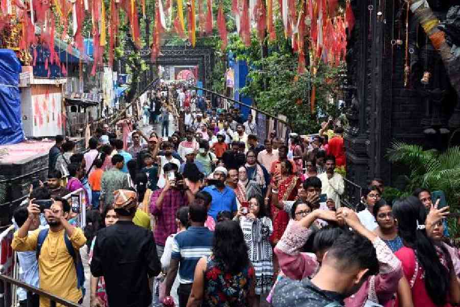Moloy Das, 45, came with his wife and eight-year-old son from New Barrackpore in North 24-Parganas. They took a train to Sealdah first and Ballygunge next. Bosepukur Sitala Mandir pandal in Kasba was their first stop. We have Ekdalia, Singhi Park, Tridhara, Ballygunge Cultural, and several other pujas in our list," said Das, who works at a jewellery showroom in central Calcutta.