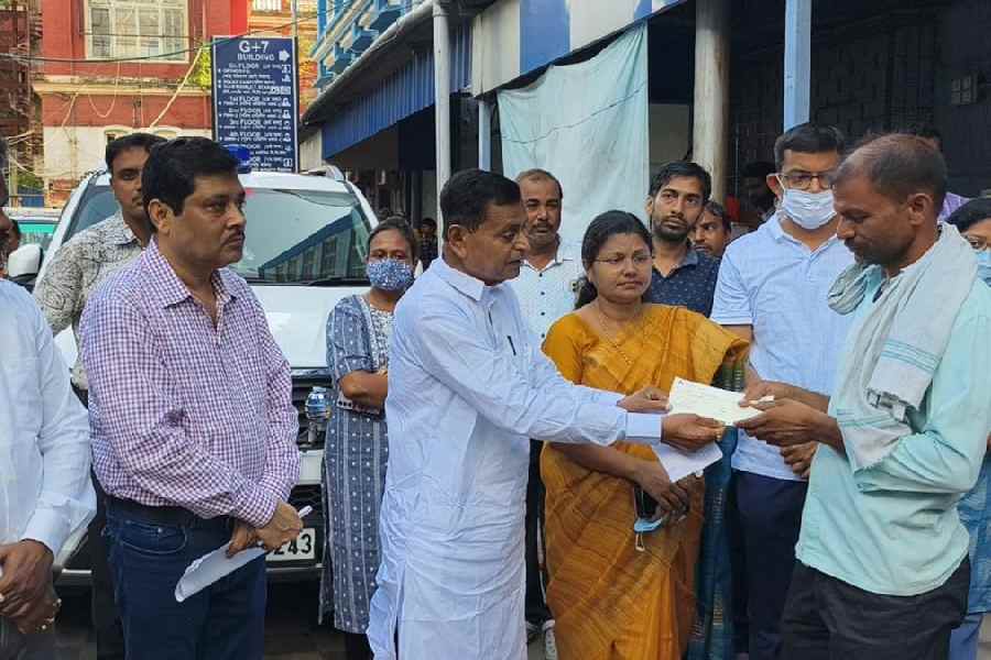 Minister Swapan Debnath hands over a compensatory cheque to a relative of one of the deceased in Friday’s highway crash in Burdwan on Saturday. Picture by Munshi Muklesur Rahaman