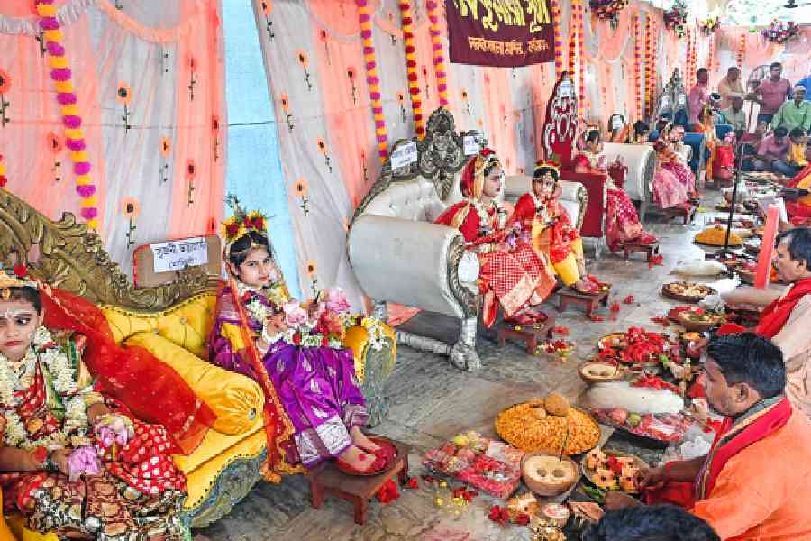 Girls being worshipped as part of the Kumari Puja ritual at the Sarbamangala temple in Burdwan on Wednesday. Picture by Munshi Muklesur Rahaman