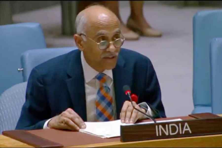 Permanent Representative of India to the United Nations, Parvathaneni Harish delivers India's statement at the UN Security Council Open Debate on Women, Peace and Security, in New York, USA, Tuesday, Oct. 7, 2025. PTI picture
